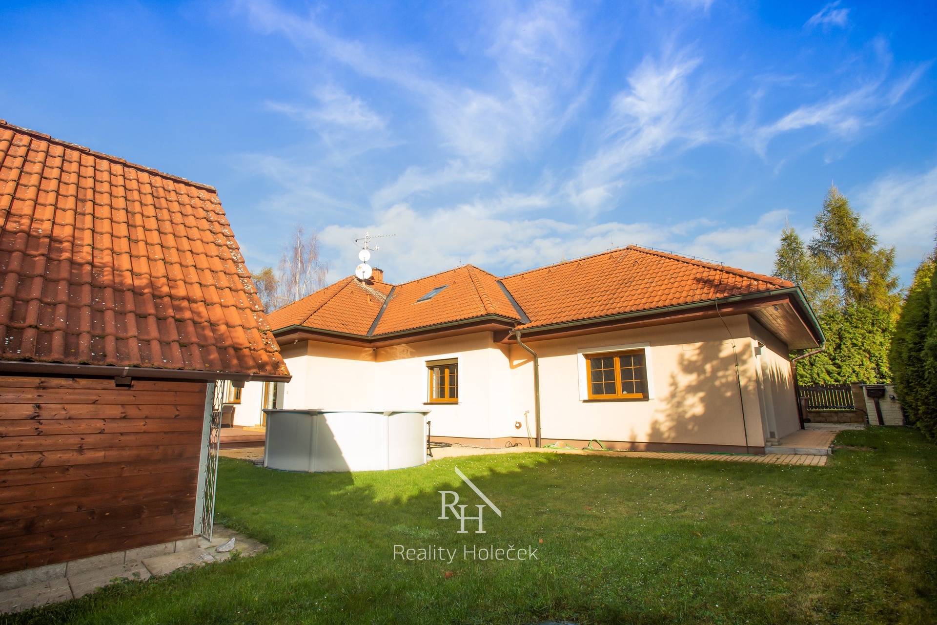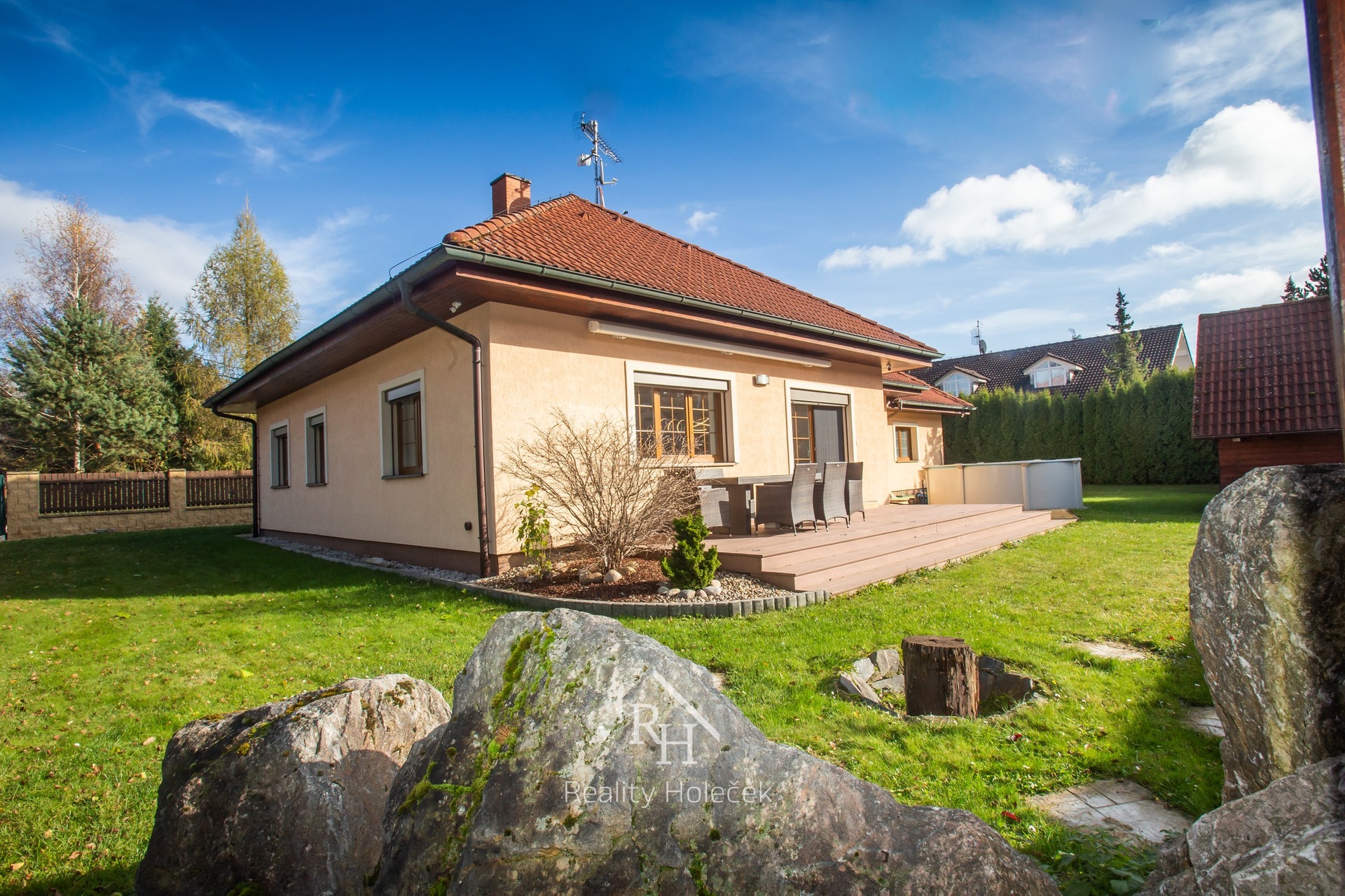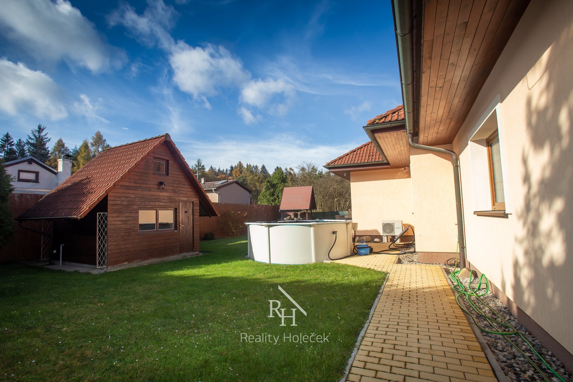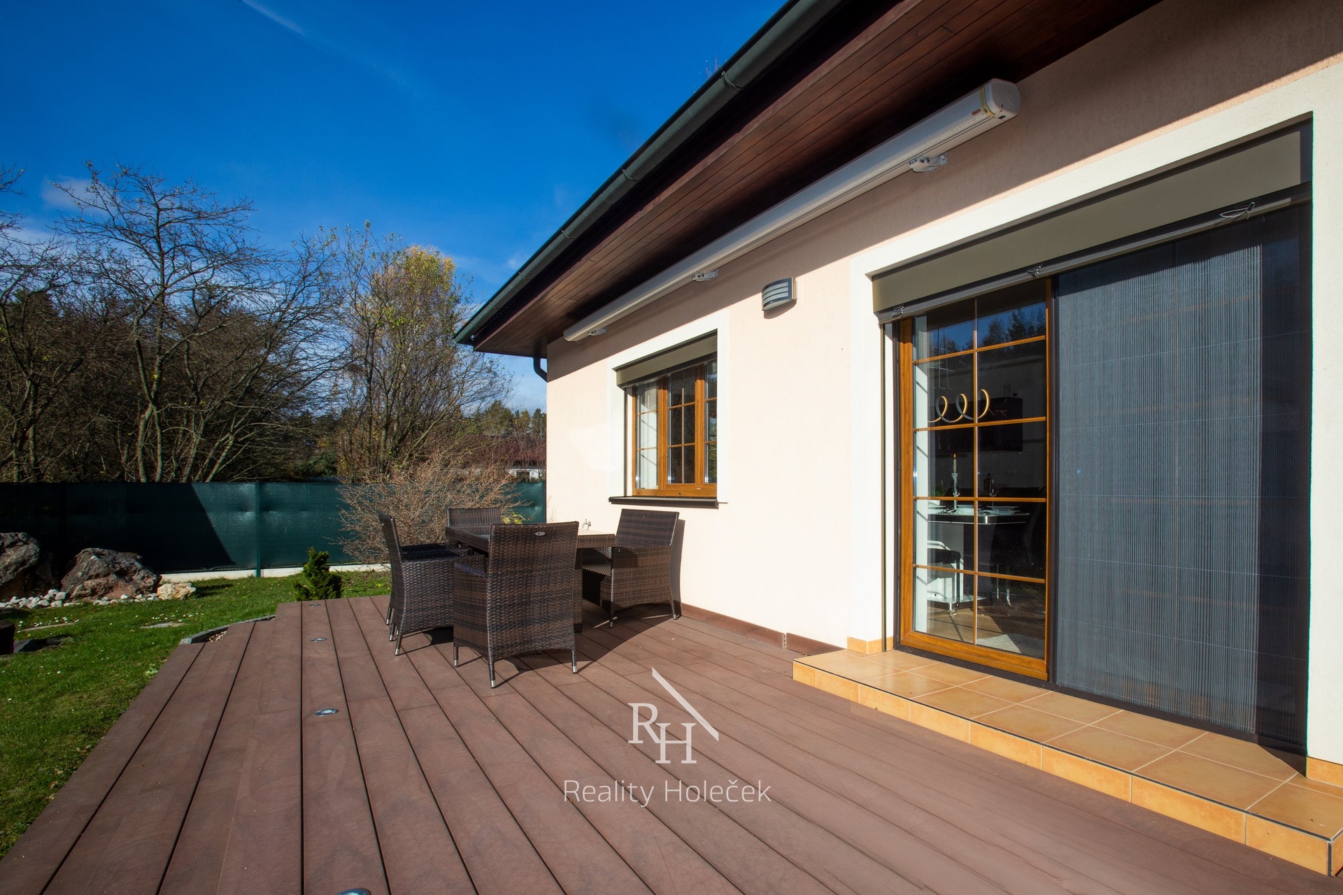 Z obývacího pokoje vejdeme na prostornou terasu z materiálu woodplastic s posezením a možností zastínění elektricky ovládanou markýzou (včetně senzoru větru). Na zahradě Vám poslouží menší kruhový bazén, dva zahradní domky, z nichž jeden byl používaný jako bar a je do něj přivedena voda i elektřina. Večer si můžete rozpálit ohniště a opéct buřty.