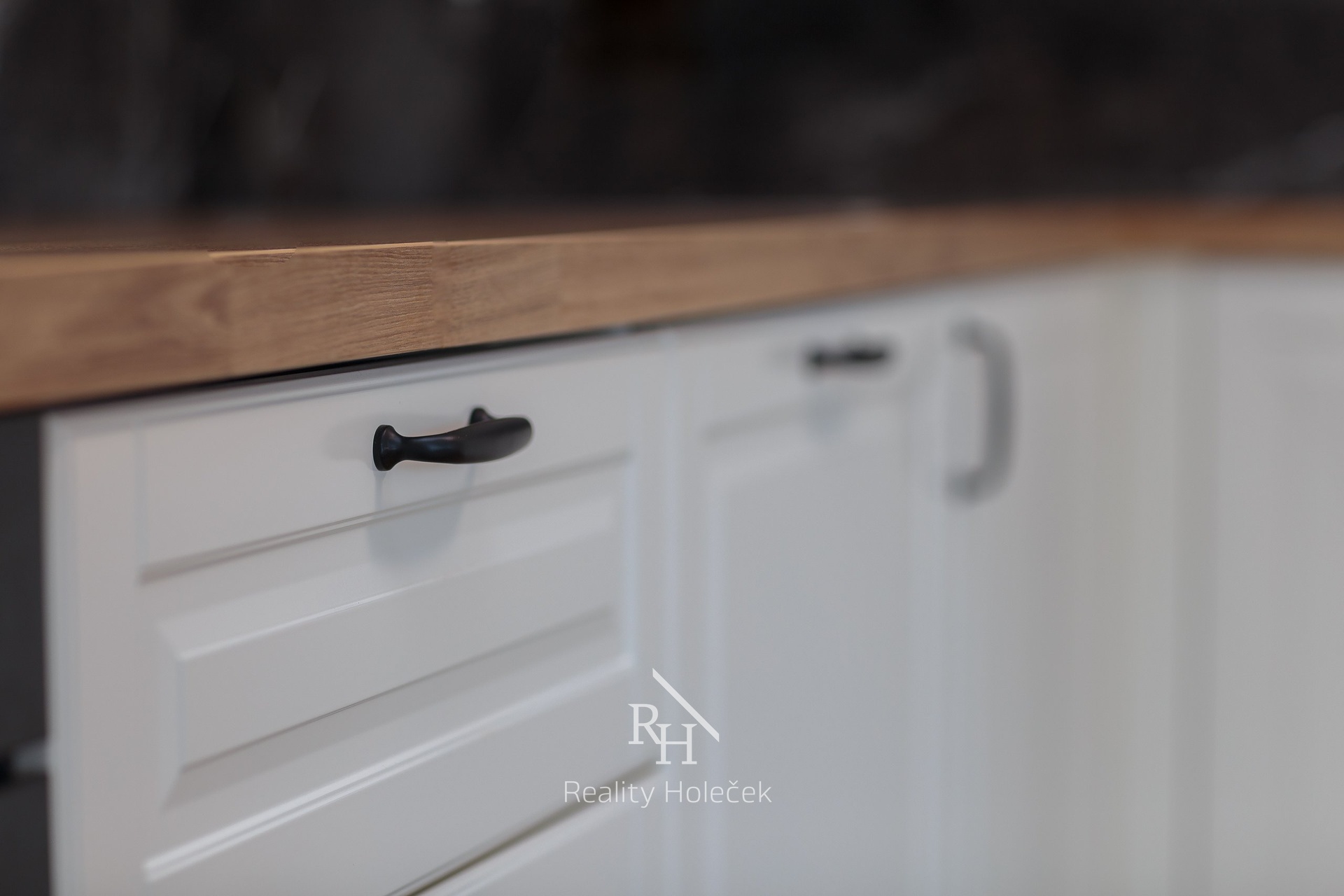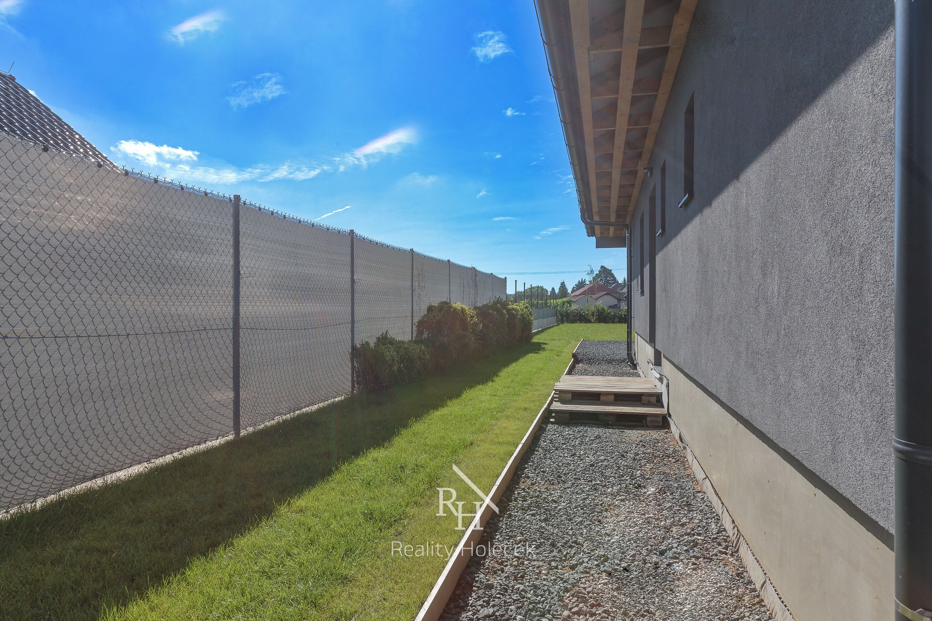 Dispozice domu je navržena prakticky a moderně: světlý obývací pokoj se vstupem na terasu a přípravou na krbová kamna, kuchyňská linka se spotřebiči a hned dvě koupelny – jedna se sprchovým koutem, druhá s vanou. Díky tomu si každý člen rodiny najde svůj komfort. Pro hosty je k dispozici třetí oddělená toaleta. Před domem zaparkujete pohodlně až tři vozy.